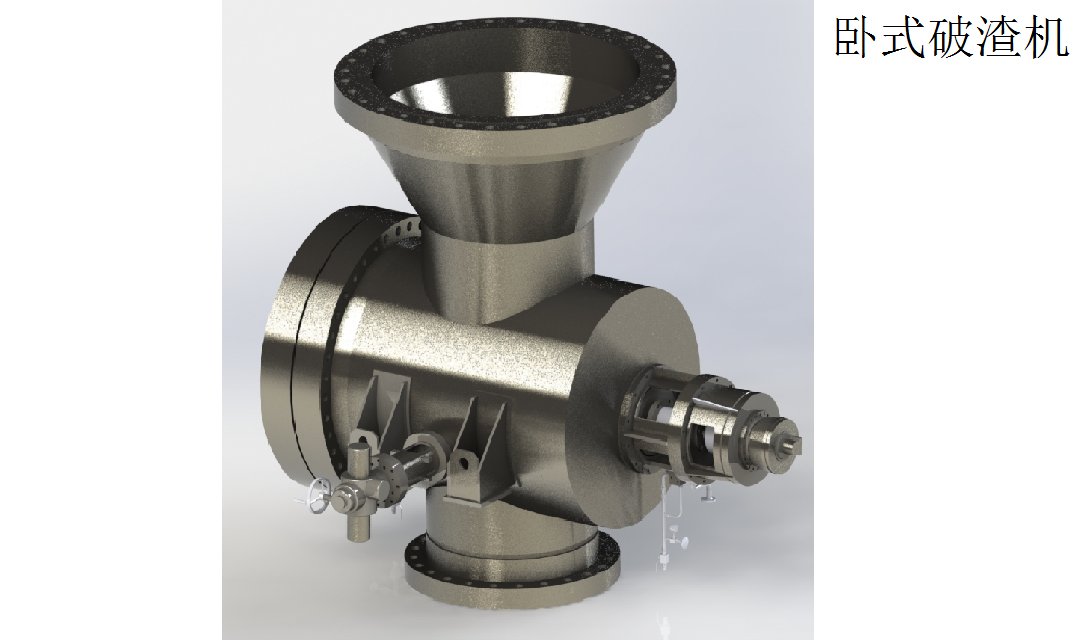 破渣機殼體為壓力容器,其核心部件動齒和靜齒偏心地安裝在殼體上,二者做相對運動,不斷將爐渣等固體進行旋轉破碎。在動齒與靜齒的上方設有導流板,以保證所有物料通過破碎系統并防止未破碎物聚集在動齒上方,同時配置液壓及電控系統,可以實現破碎系統的日常運行、監控、報警等多項功能。